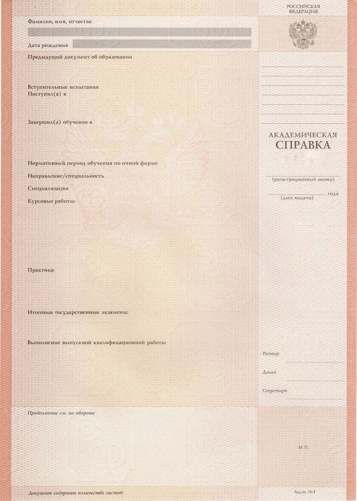 В бланке выделены поля для внесения персональных данных студента (фамилии, имени, отчества, даты рождения), а также информации об образовании (специальности, года поступления и окончания обучения с указанием пройденных практик и сданных научных работ). Справка для вуза выполняется на бланке коричневато-палевого цвета с красной печатью серии и номера документа. Вносимая информация совпадает с информацией в приложении к диплому о высшем образовании.