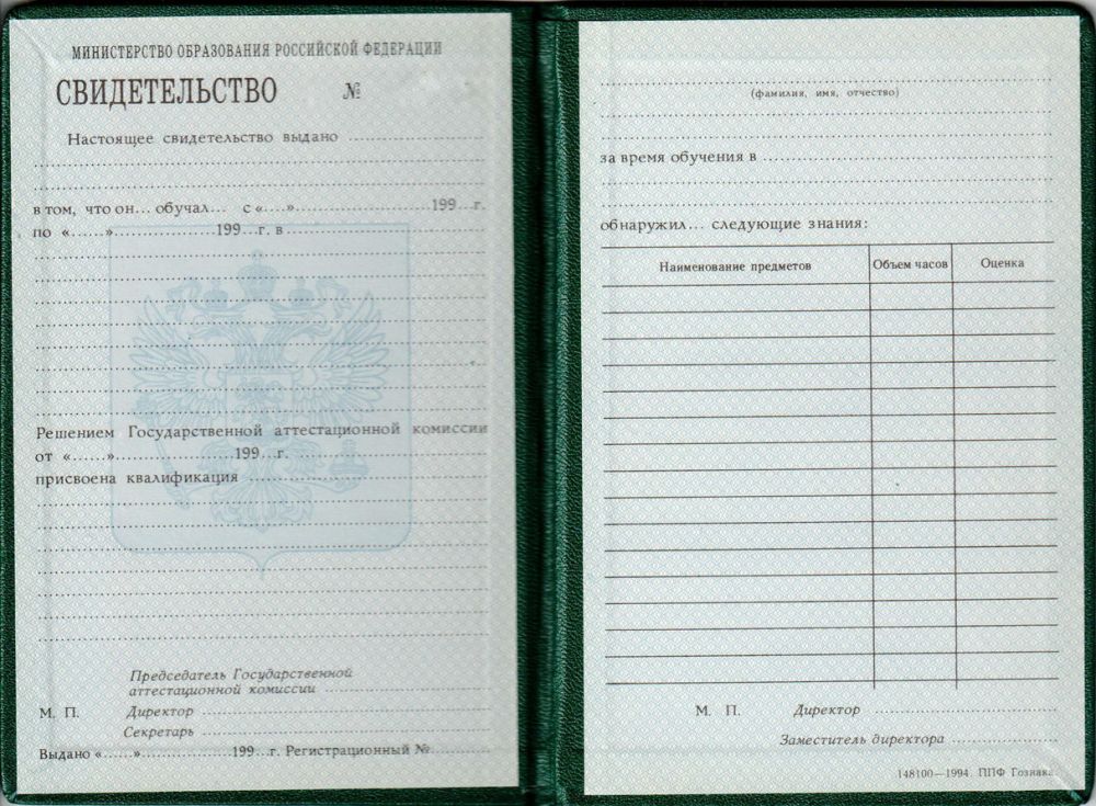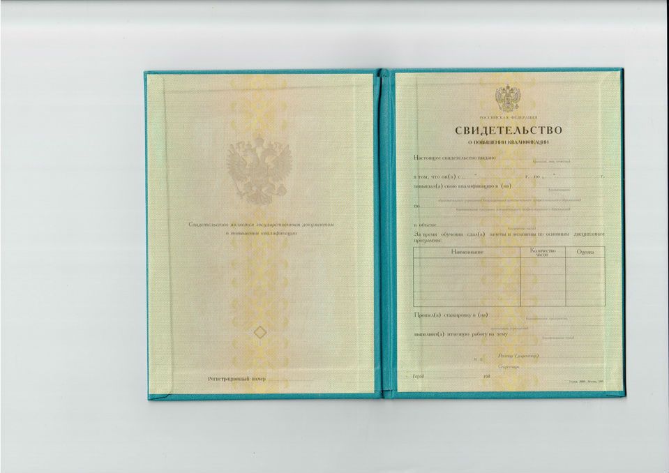 Свидетельство о повышении квалификации до 1995 года выполняется на бланке, который приклеен к твердой обложке темно-зеленого цвета. На лицевой стороне обложки вытиснено изображение герба РФ, а также слово «СВИДЕТЕЛЬСТВО». Бланк документа имеет светло-голубой цвет, на него нанесено изображение герба Российской Федерации. В документе указан регистрационный номер.