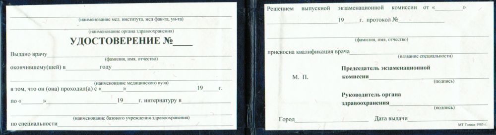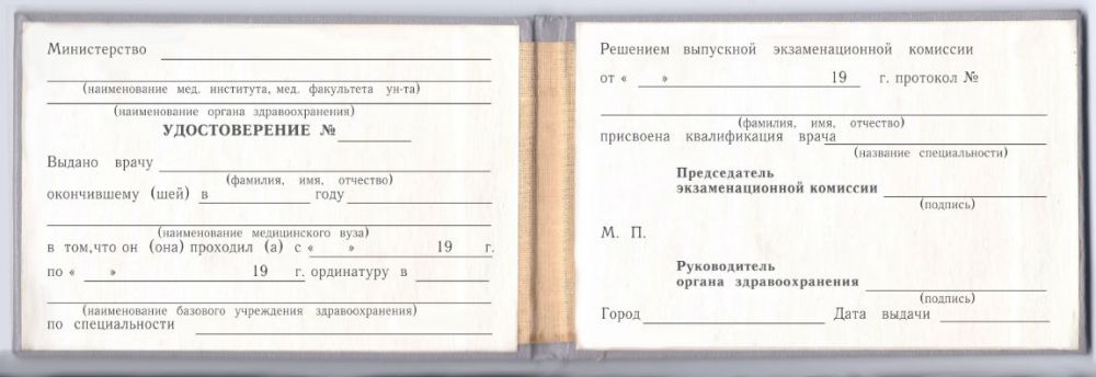 Форма документа установлена приказом Минздрава СССР, изданным в январе 1982 года. Согласно приказу, удостоверение интернатуры образца до 1992 года – это бланк, который заключен в твердую обложку черного цвета. На лицевой стороне документа содержится надпись «Удостоверение». Разворот документа – это бланки белого цвета с графами для заполнения.